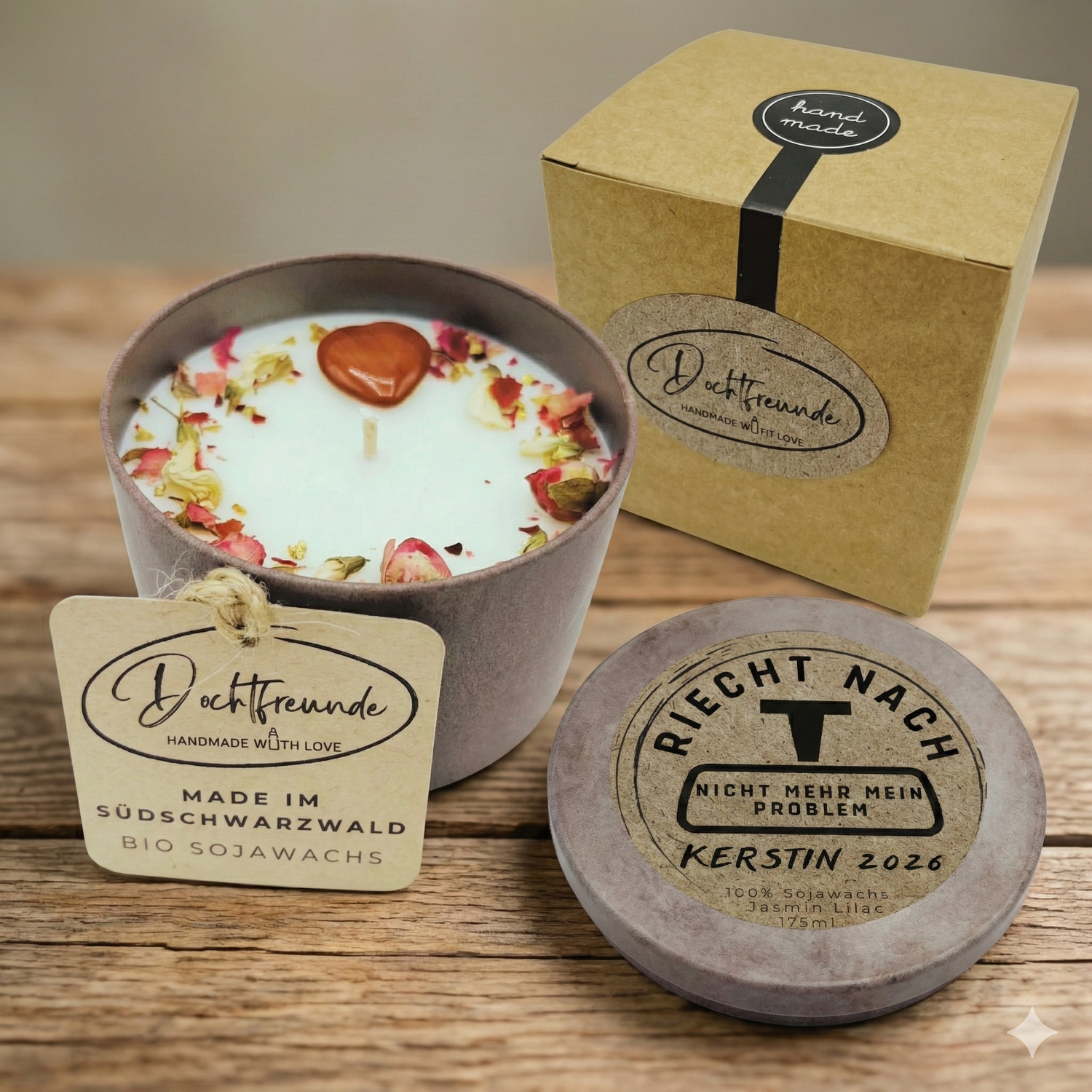Wir liefern nicht nur einen Druck, sondern ein Erlebnis. Jede Kerze wird in Bad Krozingen aus 100% veganem Sojawachs von Hand gegossen. Auf Wunsch erhältst du das komplette Premium-Set: Deine personalisierte Kerze, stilvoll verpackt in der Naturkarton-Box, inklusive Kaminzündhölzer. Ein Auspack-Moment, der echte Wertschätzung zeigt.
