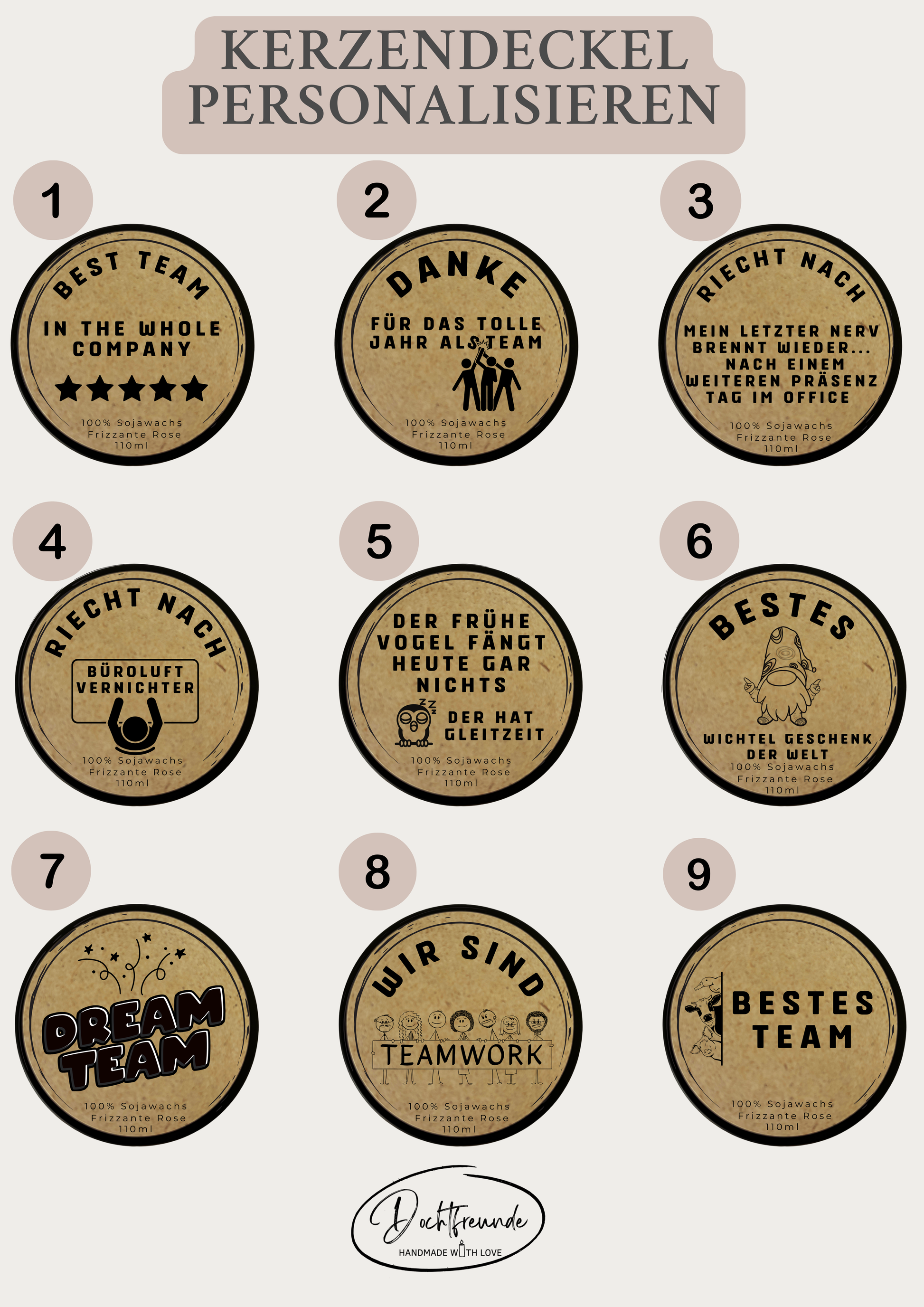 Machen Sie dieses Geschenk einzigartig, indem Sie aus unseren vorgefertigten Sprüchen wählen oder eigene hinzufügen – z. B. mit Gravur oder Etikett. Beispiele für Deckel-Designs: