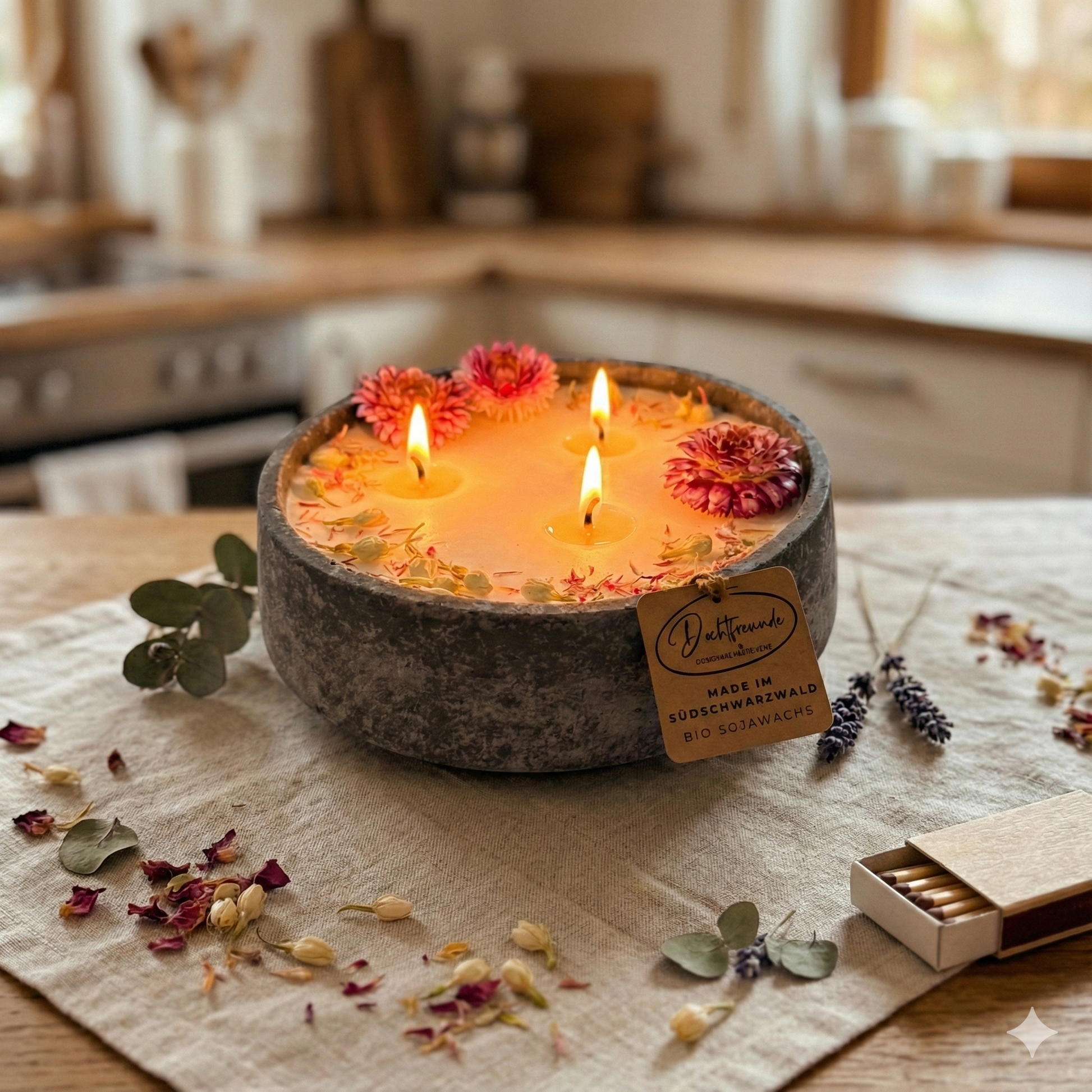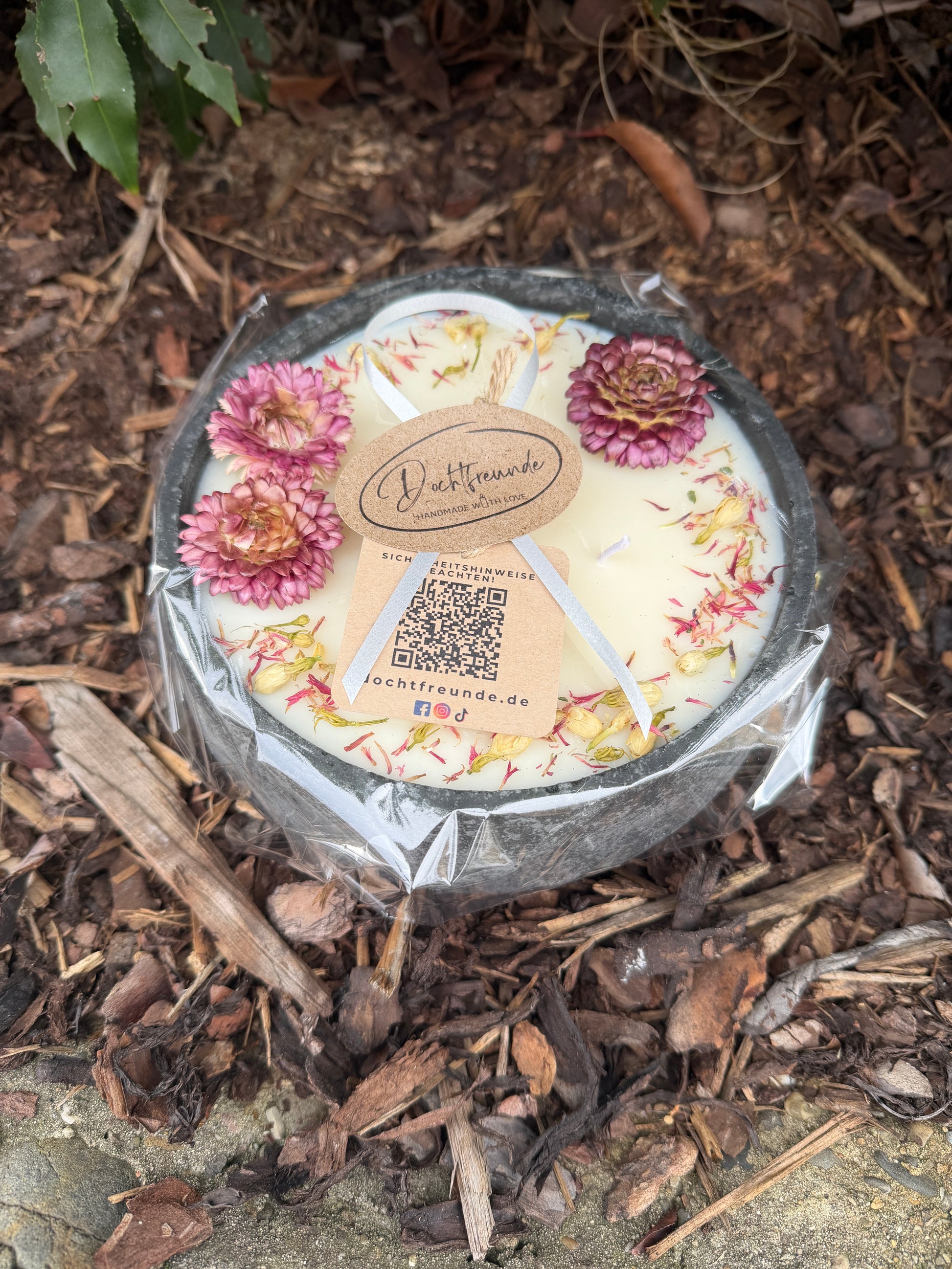 Jede Schale wird in unserer Manufaktur im Südschwarzwald von Susanne & Stephan handgegossen, versiegelt und liebevoll mit echten Trockenblumen besetzt. Da wir reines Handwerk lieben, ist jede Kerze ein Unikat: Kleine Lufteinschlüsse oder Marmorierungen im Beton sind gewollt und machen dein Exemplar einzigartig.